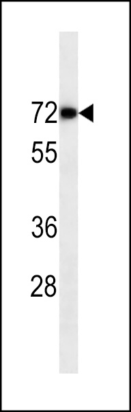C-rel Antibody (Cat. AMM02365G) western blot analysis in Hela cell line lysates (35μg/lane).This demonstrates the C-rel antibody detected the C-rel protein (arrow).
