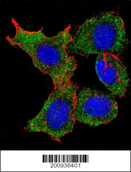 Confocal immunofluorescent analysis of C-rel Antibody (ascites) ( AMM02365G) with Hela cell followed by Alexa Fluor? 488-conjugated goat anti-mouse lgG (green). Actin filaments have been labeled with Alexa Fluor 555 phalloidin (red).DAPI was used to stain the cell nuclear (blue). |