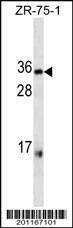 HLA-DRA Antibody (Cat. AMM02367G) western blot analysis in ZR-75-1 cell line lysates (35μg/lane).This demonstrates the HLA-DRA antibody detected the HLA-DRA protein (arrow). |