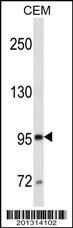 MME/CD10 (Cat. AMM02376G) western blot analysis in CEM cell line lysates (35μg/lane).This demonstrates the MME/CD10 antibody detected the MME/CD10 protein (arrow). |
