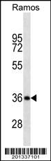MS4A1/CD20 Antibody (C-term) (Cat. AMM02387G) western blot analysis in Ramos cell line lysates (35μg/lane).This demonstrates the MS4A1/CD20 antibody detected the MS4A1/CD20 protein (arrow). |