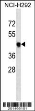 T Antibody (Cat. AMM02390G) western blot analysis in NCI-H292 cell line lysates (35μg/lane).This demonstrates the T antibody detected the T protein (arrow). |