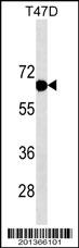 ESR1/ER Antibody (Cat. AMM02395G) western blot analysis in T47D cell line lysates (35μg/lane).This demonstrates the ESR1/ER antibody detected the ESR1/ER protein (arrow). |