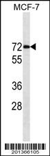 ESR1/ER Antibody (Cat. AMM02396G) western blot analysis in MCF-7 cell line lysates (35μg/lane).This demonstrates the ESR1/ER antibody detected the ESR1/ER protein (arrow). |