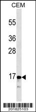 CALCA/CT Antibody (Cat. AMM02399G) western blot analysis in CEM cell line lysates (35μg/lane).This demonstrates the CALCA/CT antibody detected the CALCA/CT protein (arrow). |