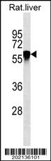 SERPINC1 Antibody (Cat. AMM02409G) western blot analysis in rat liver tissue lysates (35μg/lane).This demonstrates the SERPINC1 antibody detected the SERPINC1 protein (arrow). |