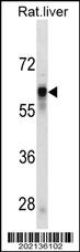 SERPINC1 Antibody (Cat. AMM02410G) western blot analysis in rat liver tissue lysates (35μg/lane).This demonstrates the SERPINC1 antibody detected the SERPINC1 protein (arrow). |