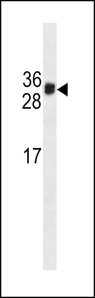 HKLK3 Antibody (C234)(Cat. AMM02424G) western blot analysis in MDA-MB231 cell line lysates (35μg/lane).This demonstrates the HKLK3 antibody detected the HKLK3 protein (arrow). |