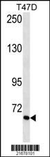 VTN Antibody (Cat. AMM02425G) western blot analysis in T47D cell line lysates (35μg/lane).This demonstrates the VTN antibody detected the VTN protein (arrow). |