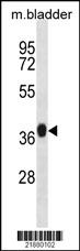 STRA8 Antibody (Cat. AMM02426G) western blot analysis in mouse bladder tissue lysates (35μg/lane).This demonstrates the STRA8 antibody detected the STRA8 protein (arrow).