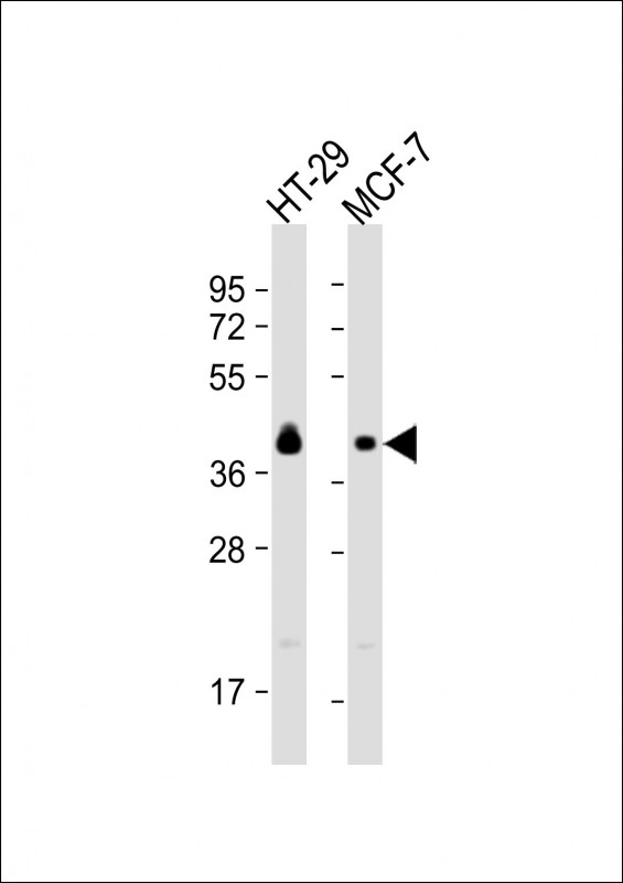 All lanes : Anti- at 1:1000 dilution Lane 1: HT-29 whole cell lysate Lane 2: MCF-7 whole cell lysate Lysates/proteins at 20 μg per lane. Secondary Goat Anti-mouse IgG, (H+L), Peroxidase conjugated at 1/10000 dilution. Predicted band size : 35 kDa Blocking/Dilution buffer: 5% NFDM/TBST. |