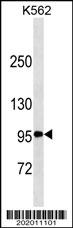 TNFRSF8/CD30 Antibody (Center)(Ascites)(Cat. AMM02429G) western blot analysis in K562 cell line lysates (35μg/lane).This demonstrates the TNFRSF8/CD30 antibody detected the TNFRSF8/CD30 protein (arrow). |