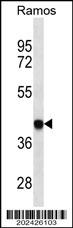 HLA-B Antibody(Cat. AMM02431G) western blot analysis in Ramos cell line lysates (35μg/lane).This demonstrates the HLA-B antibody detected the HLA-B protein (arrow). |