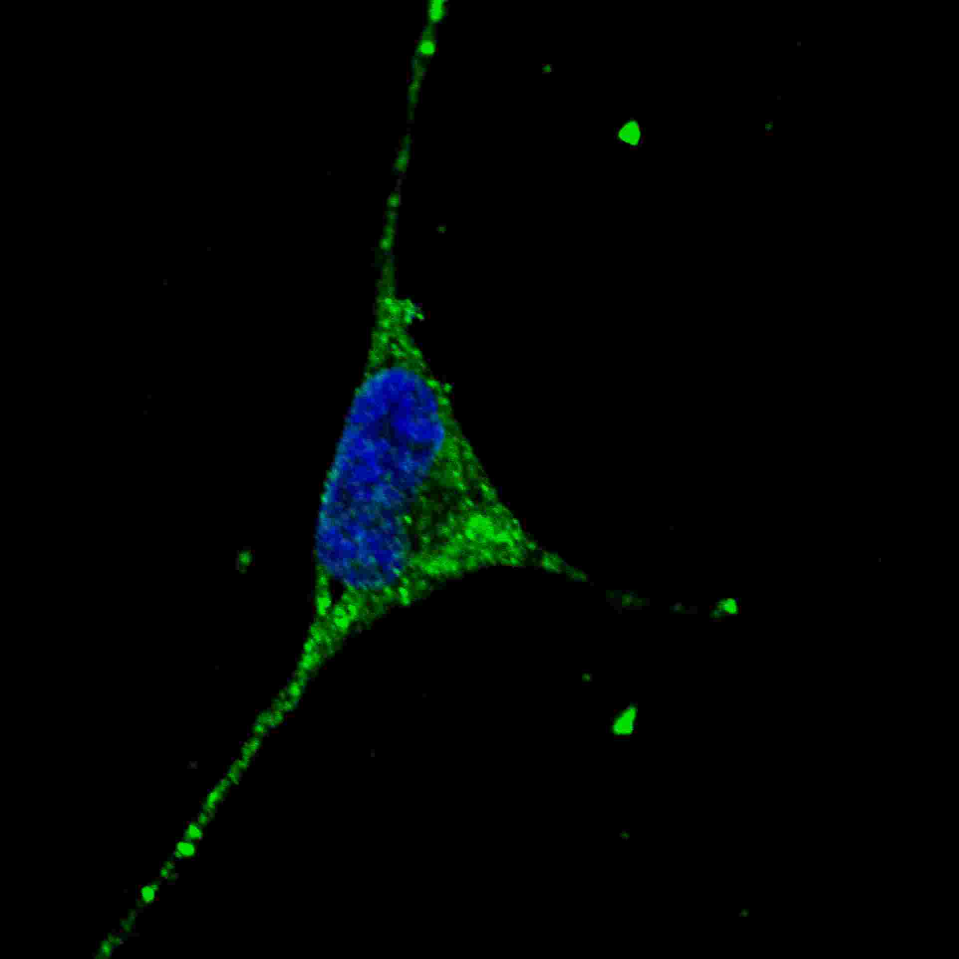 Fluorescent confocal image of SY5Y cells stained with PODXL (C-term) antibody. SY5Y cells were fixed with 4% PFA (20 min), permeabilized with Triton X-100 (0.2%, 30 min). Cells were then incubated with AMM02439G PODXL (C-term) primary antibody (1:100, 2 h at room temperature). For secondary antibody, Alexa Fluor? 488 conjugated donkey anti-mouse antibody (green) was used (1:1000, 1h). Nuclei were counterstained with Hoechst 33342 (blue) (10 μg/ml, 5 min).