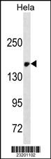 EGFR Antibody (C-term)(Ascites)(Cat. AMM02447G) western blot analysis in Hela cell line lysates (35μg/lane).This demonstrates the EGFR antibody detected the EGFR protein (arrow). |