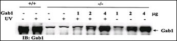 Wild-type (+/+) and Gab1-/- (-/-) cells were heat shocked (HS) at 42℃ for 1 h or irradiated with UV-B light (400 J/m2) and then incubated at 37? for 1 h. Cell lysates were prepared and subjected to immunoprecipitation (IP) with an anti-JNK2 antibody. The immunoprecipitates were resolved by SDS- PAGE and immunoblotted (IB) with anti-Gab1 antibody. Data courtesy of Dr. GS Feng at The Burnham Institute.