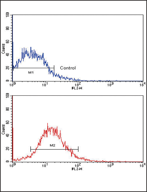 Flow cytometric analysis of HepG2 cells using EPHB2 Monoclonal Antibody(bottom histogram) compared to a negative control cell (top histogram). PE-conjugated goat-anti-mouse secondary antibodies were used for the analysis.