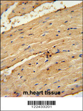 TIMP4 Antibody (Center) (Cat. APR03420G) immunohistochemistry analysis in formalin fixed and paraffin embedded mouse heart tissue followed by peroxidase conjugation of the secondary antibody and DAB staining. This data demonstrates the use of the TIMP4 Antibody (Center) for immunohistochemistry. Clinical relevance has not been evaluated. |