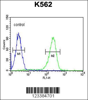 CXCR3 Antibody (Center) (Cat. APR03422G) flow cytometric analysis of K562 cells (right histogram) compared to a negative control cell (left histogram).FITC-conjugated goat-anti-rabbit secondary antibodies were used for the analysis. |