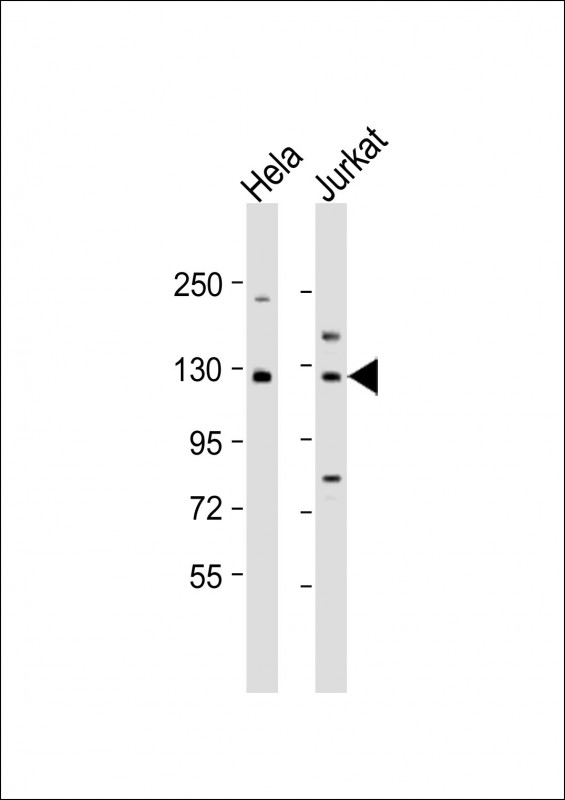 All lanes : Anti-DIS3 Antibody (Center) at 1:1000 dilution Lane 1: Hela whole cell lysate Lane 2: Jurkat whole cell lysate Lysates/proteins at 20 μg per lane. Secondary Goat Anti-Rabbit IgG, (H+L), Peroxidase conjugated at 1/10000 dilution. Predicted band size : 109 kDa Blocking/Dilution buffer: 5% NFDM/TBST.