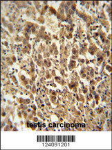 DIS3 antibody (Center) (Cat. APR03425G) immunohistochemistry analysis in formalin fixed and paraffin embedded human testis carcinoma followed by peroxidase conjugation of the secondary antibody and DAB staining. This data demonstrates the use of the DIS3 antibody (Center) for immunohistochemistry. Clinical relevance has not been evaluated. |
