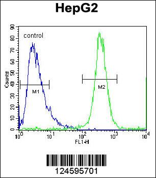 FBXO2 Antibody (C-term) (Cat. APR03427G) flow cytometric analysis of HepG2 cells (right histogram) compared to a negative control cell (left histogram).FITC-conjugated goat-anti-rabbit secondary antibodies were used for the analysis.