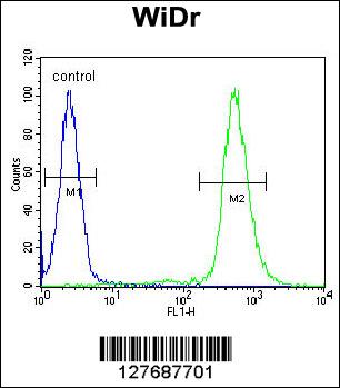 RPS6 Antibody (Ser240/244) (Cat. APR03431G) flow cytometric analysis of WiDr cells (right histogram) compared to a negative control cell (left histogram).FITC-conjugated goat-anti-rabbit secondary antibodies were used for the analysis. |
