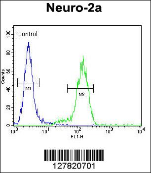 VWA3B Antibody (C-term) (Cat. APR03435G) flow cytometric analysis of Neuro-2a cells (right histogram) compared to a negative control cell (left histogram).FITC-conjugated goat-anti-rabbit secondary antibodies were used for the analysis. |