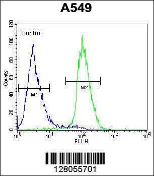 C1orf51 Antibody (N-term) (Cat. APR03438G) flow cytometric analysis of A549 cells (right histogram) compared to a negative control cell (left histogram).FITC-conjugated goat-anti-rabbit secondary antibodies were used for the analysis. |