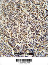 DENND1B antibody (N-term) (Cat. APR03439G) immunohistochemistry analysis in formalin fixed and paraffin embedded human lymph tissue followed by peroxidase conjugation of the secondary antibody and DAB staining. This data demonstrates the use of the DENND1B antibody (N-term) for immunohistochemistry. Clinical relevance has not been evaluated. |