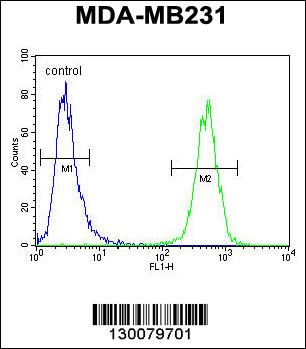 HHLA2 Antibody (N-term) (Cat. APR03458G) flow cytometric analysis of MDA-MB231 cells (right histogram) compared to a negative control cell (left histogram).FITC-conjugated goat-anti-rabbit secondary antibodies were used for the analysis. |