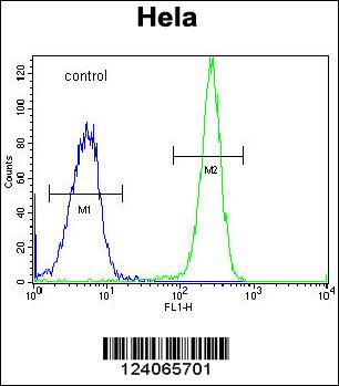 HYAL2 Antibody (C-term) (Cat. APR03471G) flow cytometric analysis of Hela cells (right histogram) compared to a negative control cell (left histogram).FITC-conjugated goat-anti-rabbit secondary antibodies were used for the analysis. |