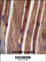 THUM3 Antibody (Center) (Cat. APR03483G) immunohistochemistry analysis in formalin fixed and paraffin embedded human skeletal muscle followed by peroxidase conjugation of the secondary antibody and DAB staining. This data demonstrates the use of the THUM3 Antibody (Center) for immunohistochemistry. Clinical relevance has not been evaluated. |