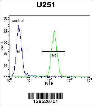 AMN1 Antibody (N-term) (Cat. APR03491G) flow cytometric analysis of U251 cells (right histogram) compared to a negative control cell (left histogram).FITC-conjugated goat-anti-rabbit secondary antibodies were used for the analysis.