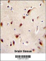 IQCJ Antibody (C-term) (Cat. APR03492G) immunohistochemistry analysis in formalin fixed and paraffin embedded human brain tissue followed by peroxidase conjugation of the secondary antibody and DAB staining. This data demonstrates the use of the IQCJ Antibody (C-term) for immunohistochemistry. Clinical relevance has not been evaluated. |