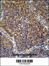 CD2BP2 antibody(N-term) (Cat. APR03500G) immunohistochemistry analysis in formalin fixed and paraffin embedded human lung carcinoma followed by peroxidase conjugation of the secondary antibody and DAB staining. This data demonstrates the use of the CD2BP2 antibody(N-term) for immunohistochemistry. Clinical relevance has not been evaluated.