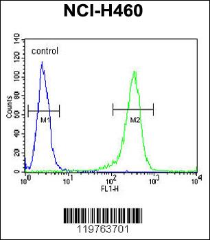 CD2BP2 Antibody (N-term) (Cat. APR03500G) flow cytometric analysis of NCI-H460 cells (right histogram) compared to a negative control cell (left histogram).FITC-conjugated goat-anti-rabbit secondary antibodies were used for the analysis. |