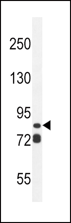 ASAP3 Antibody (N-term) (Cat. APR03514G) western blot analysis in ZR-75-1 cell line lysates (35ug/lane).This demonstrates the ASAP3 antibody detected the ASAP3 protein (arrow).
