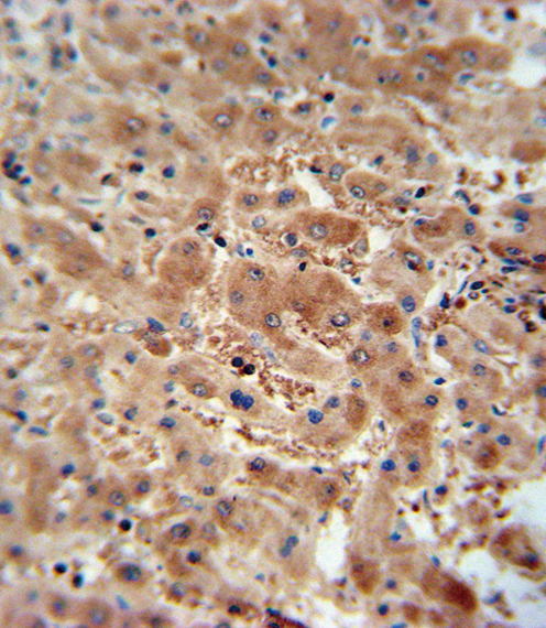 ASAP3 antibody (N-term) (Cat. APR03514G) immunohistochemistry analysis in formalin fixed and paraffin embedded human hepatocarcinoma followed by peroxidase conjugation of the secondary antibody and DAB staining. This data demonstrates the use of the ASAP3 antibody (N-term) for immunohistochemistry. Clinical relevance has not been evaluated. |