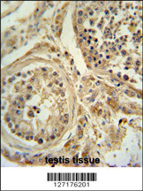 WDR51B antibody (C-term) (Cat. APR03518G) immunohistochemistry analysis in formalin fixed and paraffin embedded human testis tissue followed by peroxidase conjugation of the secondary antibody and DAB staining. This data demonstrates the use of the WDR51B antibody (C-term) for immunohistochemistry. Clinical relevance has not been evaluated. |