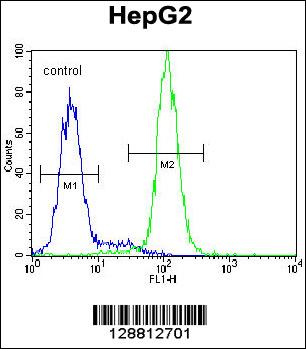 CST9 Antibody (C-term) (Cat. APR03524G) flow cytometric analysis of HepG2 cells (right histogram) compared to a negative control cell (left histogram).FITC-conjugated goat-anti-rabbit secondary antibodies were used for the analysis. |