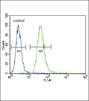 TNFR-S274 Antibody (Cat. APR03531G) flow cytometric analysis of A549 cells (right histogram) compared to a negative control cell (left histogram).FITC-conjugated goat-anti-rabbit secondary antibodies were used for the analysis. |