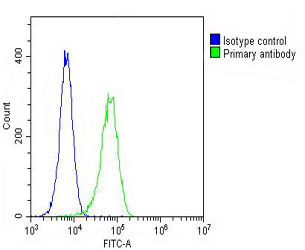 Overlay histogram showing Hela cells stained with APR03540G (green line). The cells were fixed with 2% paraformaldehyde (10 min) and then permeabilized with 90% methanol for 10 min. The cells were then icubated in 2% bovine serum albumin to block non-specific protein-protein interactions followed by the antibody (APR03540G, 1:25 dilution) for 60 min at 37?C. The secondary antibody used was Goat-Anti-Rabbit IgG, DyLight? 488 Conjugated Highly Cross-Adsorbed(OH191631) at 1/200 dilution for 40 min at 37?C. Isotype control antibody (blue line) was rabbit IgG (1μg/1x10^6 cells) used under the same conditions. Acquisition of >10, 000 events was performed.