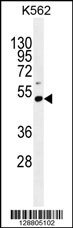 PRAMEF10 Antibody (C-term) (Cat. APR03543G) western blot analysis in K562 cell line lysates (35ug/lane).This demonstrates the PRAMEF10 antibody detected the PRAMEF10 protein (arrow). |