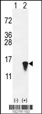 Western blot analysis of ISG15 (arrow) using rabbit polyclonal hISG15-A46 (Cat. APR03570G). 293 cell lysates (2 ug/lane) either nontransfected (Lane 1) or transiently transfected with the ISG15 gene (Lane 2) .