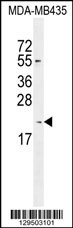 KILLIN Antibody (C-term) (Cat. APR03585G) western blot analysis in MDA-MB435 cell line lysates (35ug/lane).This demonstrates the KILLIN antibody detected the KILLIN protein (arrow). |