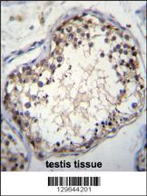 OVOS Antibody (N-term) (Cat. APR03588Ga)immunohistochemistry analysis in formalin fixed and paraffin embedded human testis tissue followed by peroxidase conjugation of the secondary antibody and DAB staining.This data demonstrates the use of OVOS Antibody (N-term) for immunohistochemistry. Clinical relevance has not been evaluated. |