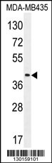 LILRA5 Antibody (N-term) (Cat. APR03590G) western blot analysis in MDA-MB435 cell line lysates (35ug/lane).This demonstrates the LILRA5 antibody detected the LILRA5 protein (arrow). |