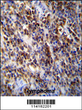 Parp9 Antibody (C-term) (Cat. APR03594G)immunohistochemistry analysis in formalin fixed and paraffin embedded human lymphoma followed by peroxidase conjugation of the secondary antibody and DAB staining.This data demonstrates the use of Parp9 Antibody (C-term) for immunohistochemistry. Clinical relevance has not been evaluated. |