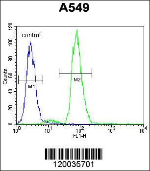RAD17 Antibody (Center) (Cat. APR03603G) flow cytometric analysis of A549 cells (right histogram) compared to a negative control cell (left histogram).FITC-conjugated goat-anti-rabbit secondary antibodies were used for the analysis. |
